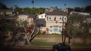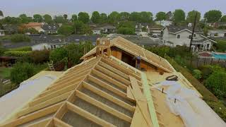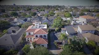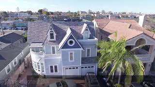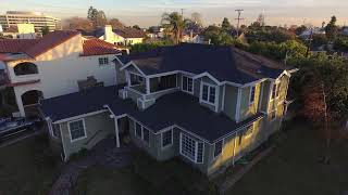 ButtonAn aerial fly-over of a Spanish Colonial with a clay roof and roof deck and veranda. Designed to complement traditional mission-styled architecture (think La Costa.)